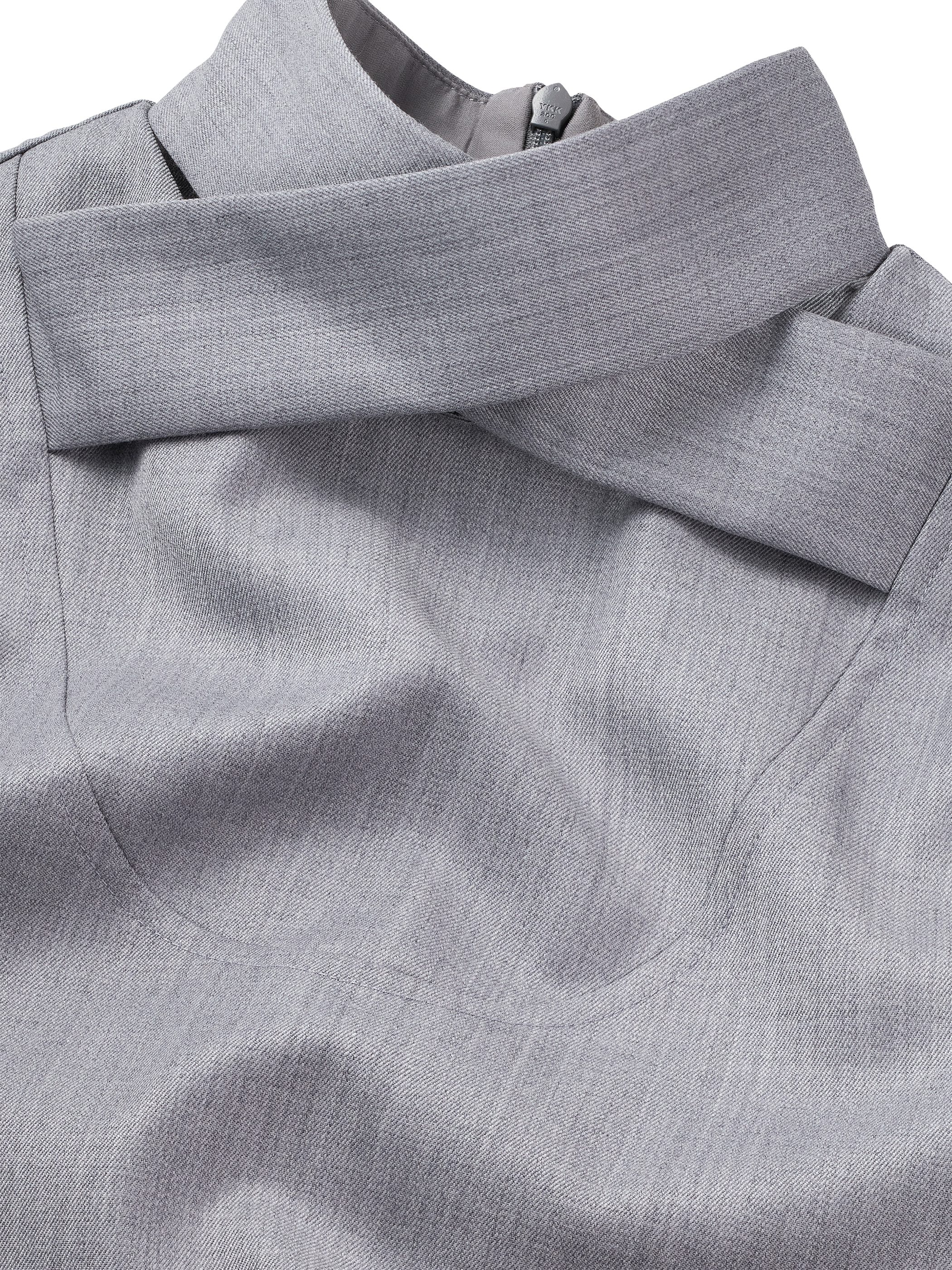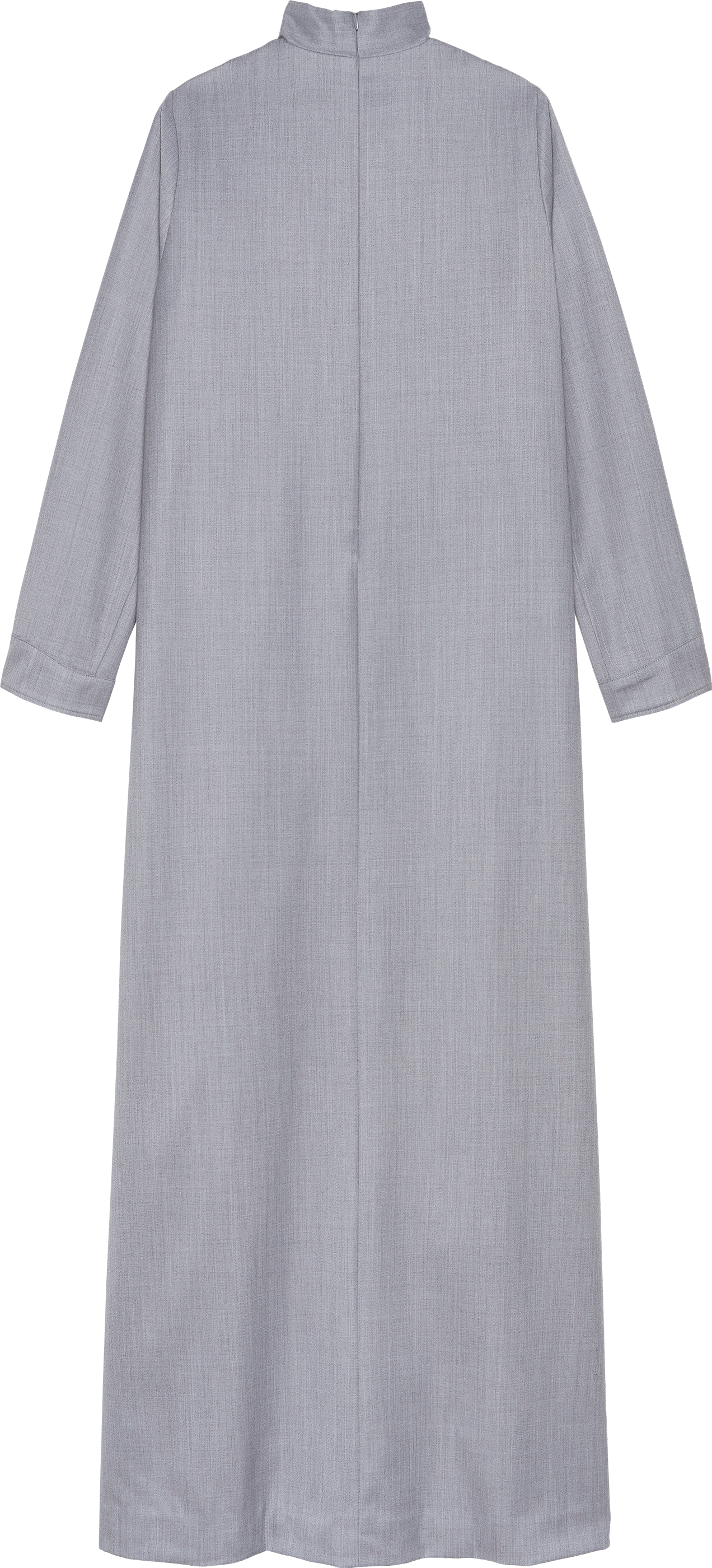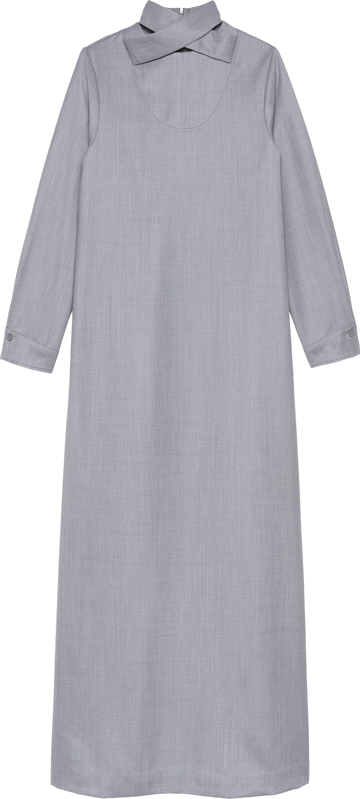 Sleek and sophisticated, this light grey wool maxi dress balances modern tailoring with modest elegance. Featuring a distinctive overlapping collar at the neckline, long sleeves, and refined cuff details, it is finished with a gentle chest contour that adds subtle depth to the design.