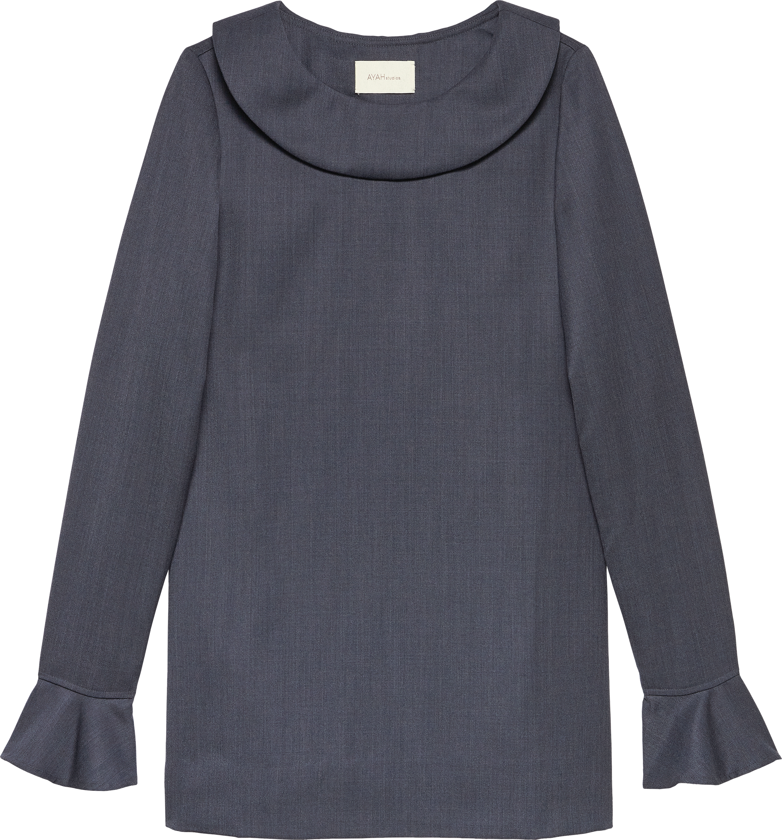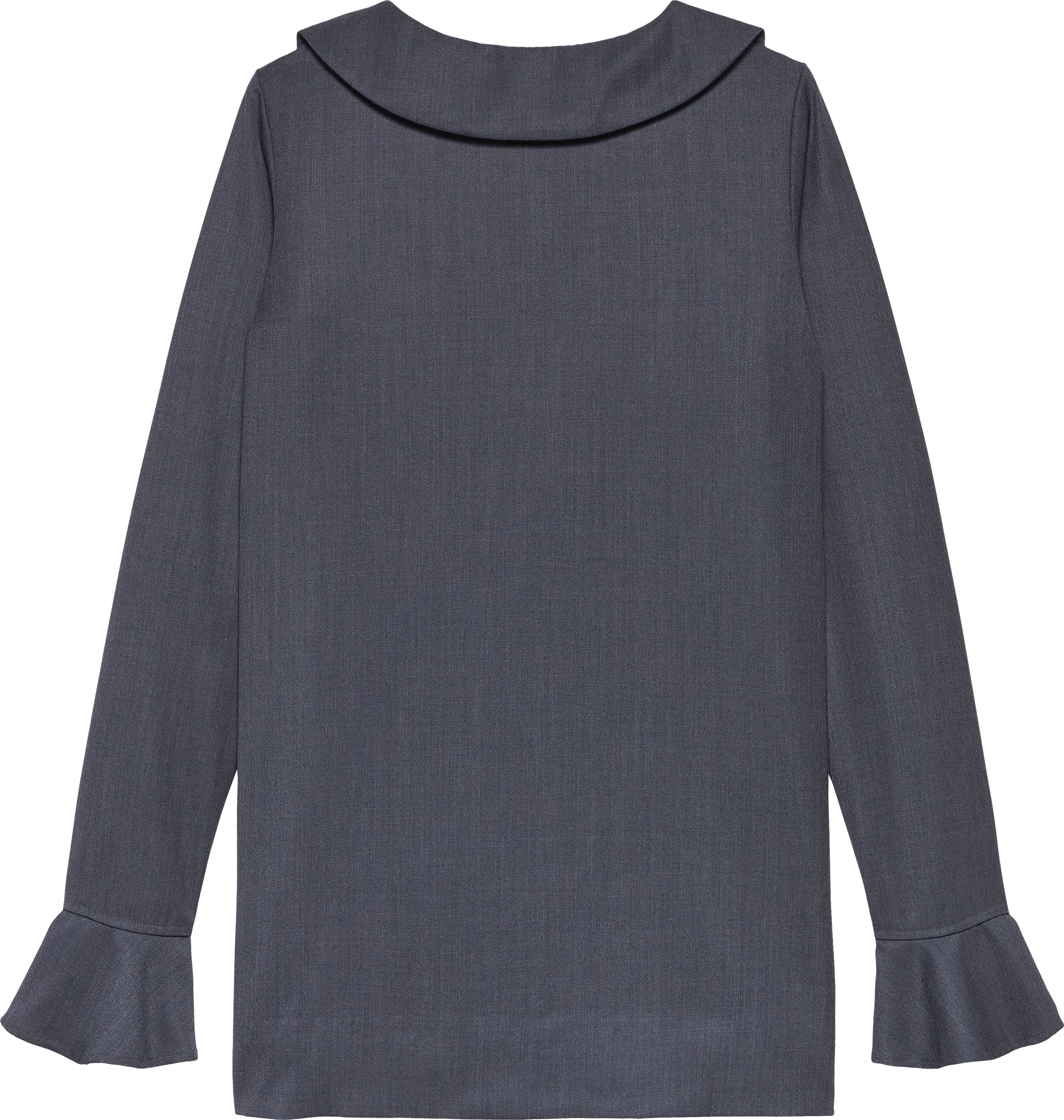 Minimalist in form yet rich in detail, this dark grey wool shirt embodies timeless refinement. The softly rounded collar frames the neckline with understated grace, while the long sleeves end in subtle flared cuffs — a detail that adds quiet sophistication without excess.